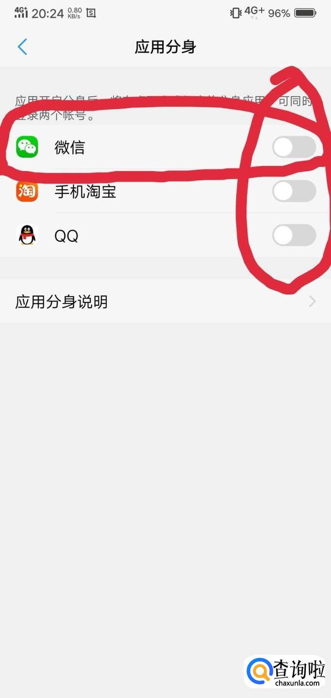 打开后发现有三个应用可以分身,打开微信开关就可以分身了。