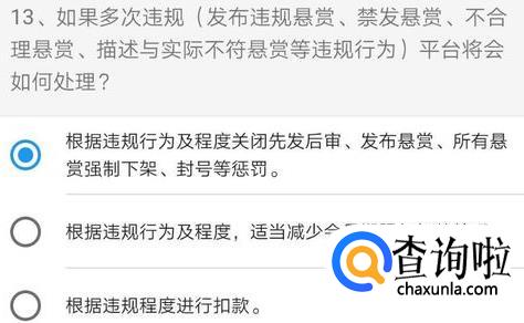 答:根据违规行为及程度关闭先发后审、发布悬赏、所有悬赏强制下架、封号等处罚。