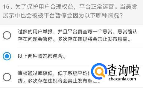 (16)为了保护用户合理权益,平台正常运营。当悬赏展示中也会被平台暂停会因为以下哪种情况?