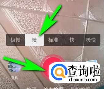 如图所示,选择“慢”(或者是点“极慢”);再点红色开始拍摄按钮;那么,接下来整个视频的动作都是慢动作。