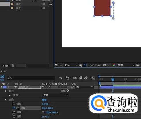 创建合成完成之后,我们先随意来创建一个简单的动画,调整一不同时间下的位置状态即可进行制作。