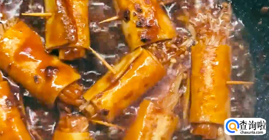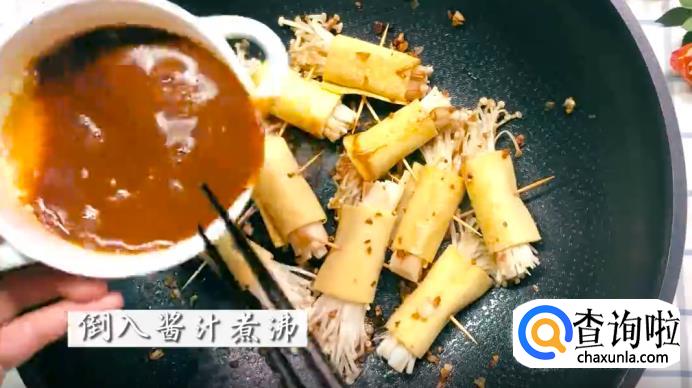 接着,往锅里加入调好的酱汁,直至煮沸,在煮的过程中需要给金针菇卷不时地翻面。