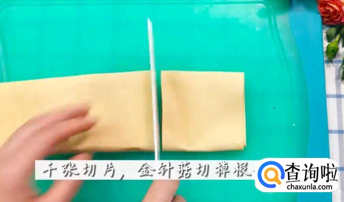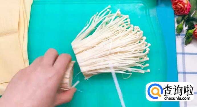 将准备好的千张切成片,再把金针菇洗干净,切掉它的根部。