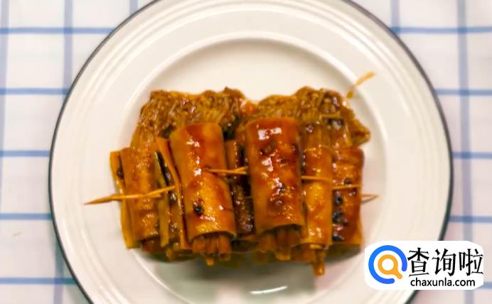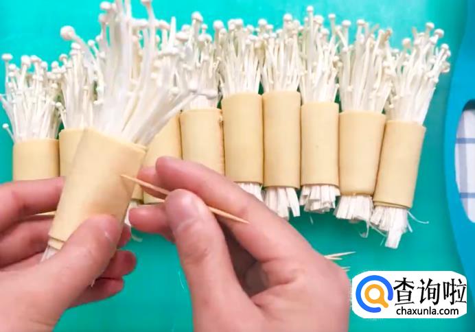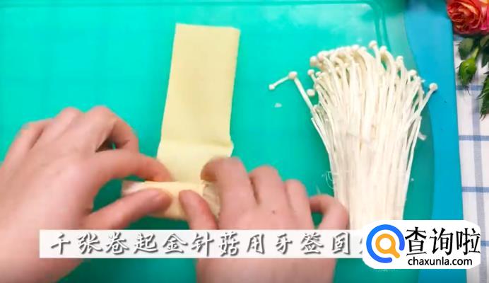 把金针菇用千张卷起来,再取一根牙签插入进行固定。