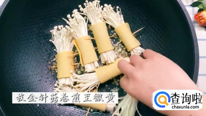 然后,将金针菇卷放进去,煎至呈微微金黄色(在煎的时候记得翻面)。