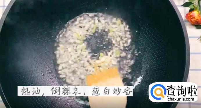 锅里热好油,倒入蒜末和葱白炒香。