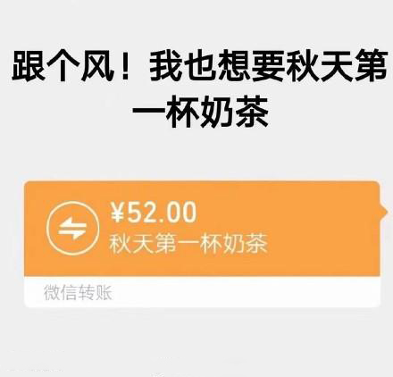 秋天的第一杯奶茶:2020年年9月22日是秋分,所以很多人感觉到秋天了。但其实秋分是意味着秋意渐浓,立秋才是到了秋天。网络上有网友晒聊天记录,有人给她发52.0块钱的红包,说请她喝秋天的第一杯奶茶。因为感觉很浪漫、甜蜜,之后网络上开始很多人给自己喜欢的人发秋天第一杯奶茶的红包,所以这只是秀恩爱的一种新型方式,给对方发这个红包主要也是表达对对方的喜欢。