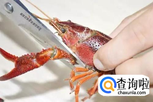 剪虾时,鲜活的小龙虾威力挺大,为避免虾钳夹手,我们先将其“敲晕”,用手捏住小龙虾头部,先剪去小龙虾的右钳,再剪去左钳,将剪下的虾钳洗净备用,这可以食用的,不要丢掉。