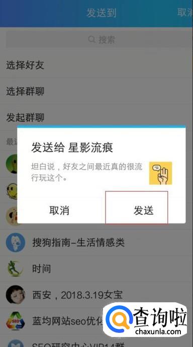 选择好友,在好友里面选择自己要发给送好友,点击发送即可。这样就给好友成功了坦白说;
