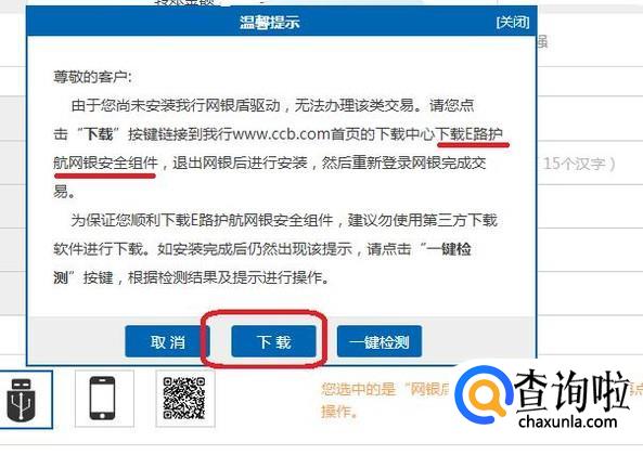 我们发现,此时用U盾转账是不行的,会弹出如下选项框,需要下载网银安全组件,我们点击“下载”,转到安全组件下载页面,找到链接后,点击下载,下载完之后按提示安装。