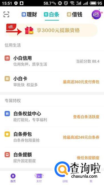 进入京东金融APP界面,在上方选择“白条”,然后点击系统推送的“享3000元提额资格”
