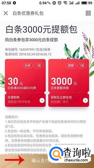 进入白条3000元提额包详情介绍界面,查看温馨提示等信息,确认购买之后点击下方“确认支付”