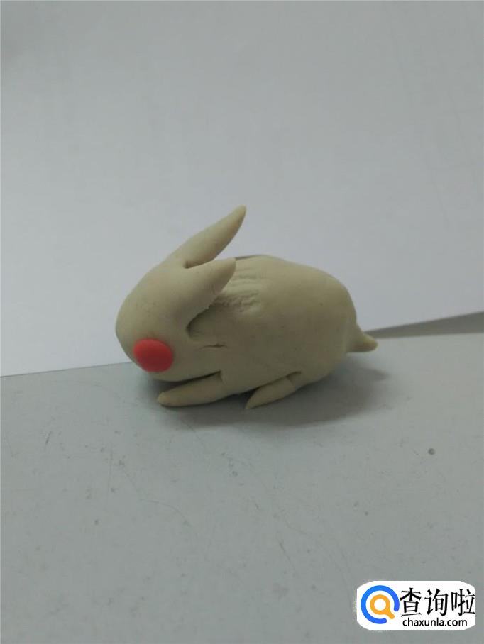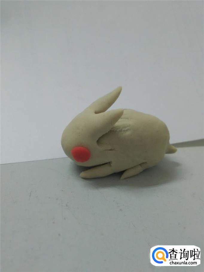 再用红色团两个小球,粘在头部两侧,当作眼睛,小兔子就做完了。