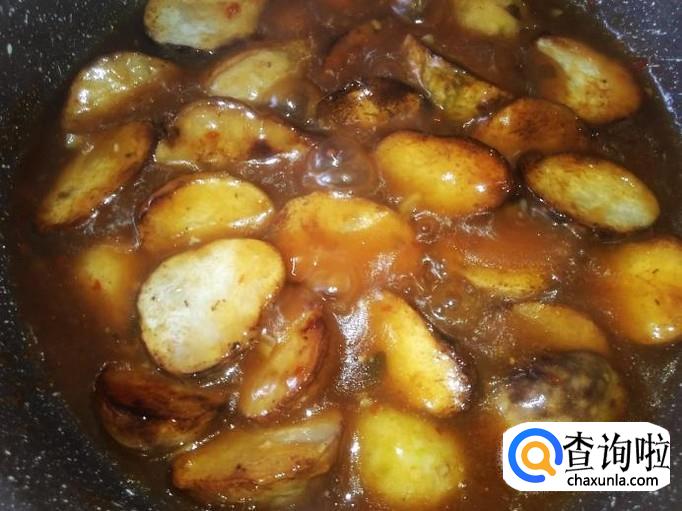 然后薯子回锅,翻炒一下,大火收汁10秒左右就可以了。
