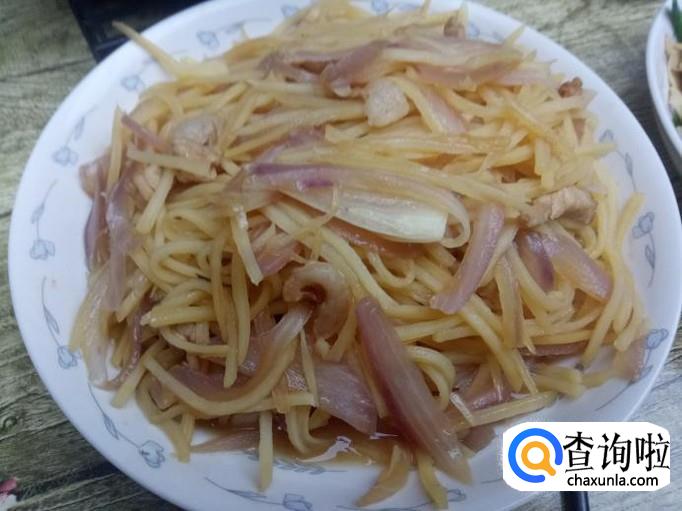 处理好食材,首先把肉丝入锅,煸出多余的油脂,再放入土豆丝,临出锅前进行调味,就可以了。