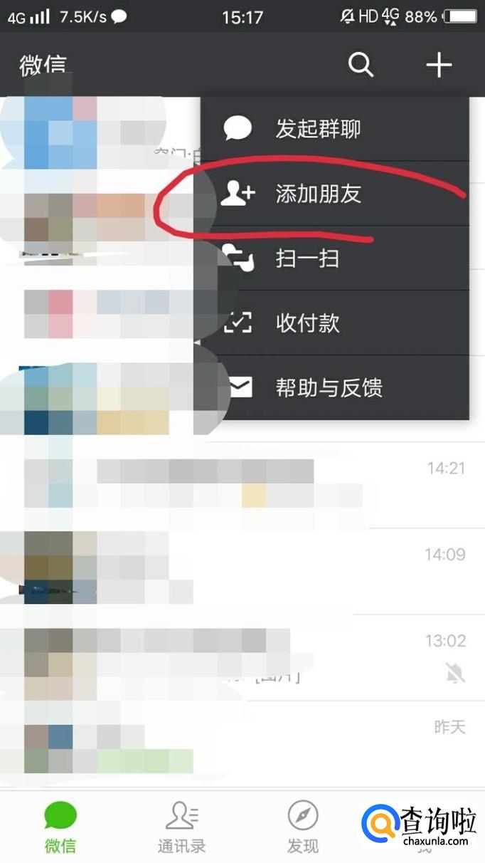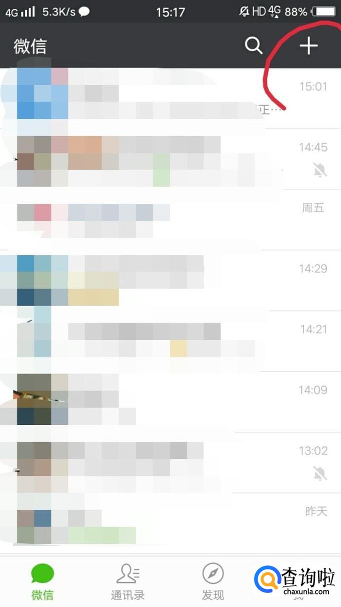 打开微信后,点击界面右上角的加号。
