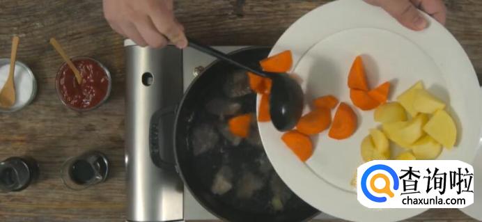 取一口炖锅,放入牛腩肉、胡萝卜和土豆。