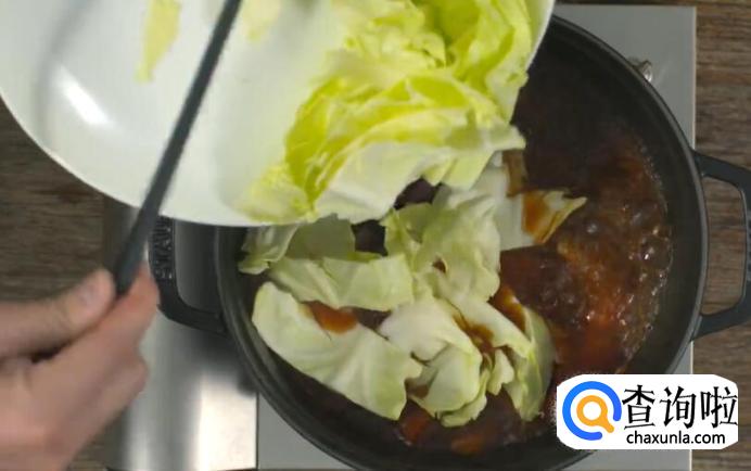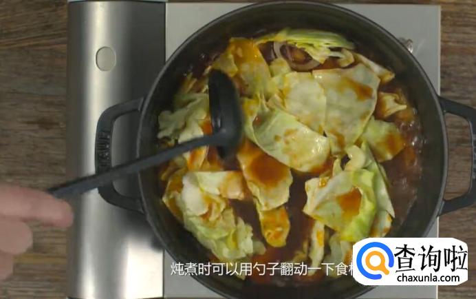 等牛腩炖了一个半小时的时候,将煸炒过的洋葱和卷心菜一块倒入炖锅中,和牛腩一起炖。