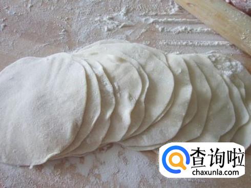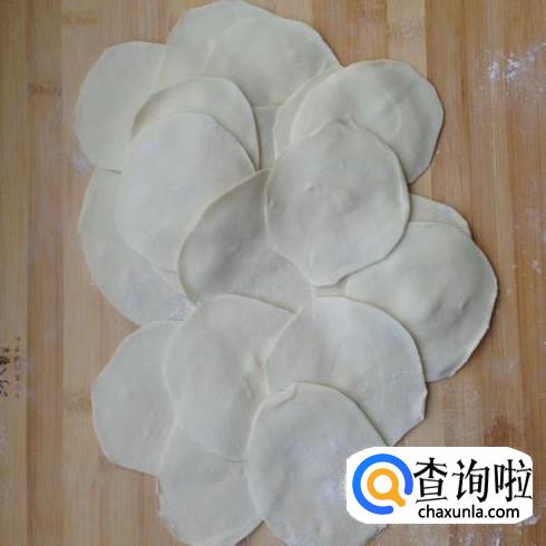馅做好了就开始来做皮,先将面粉搓成团,然后再把搓好的面粉切成团子,并用擀面杖做出饺子皮的形状。