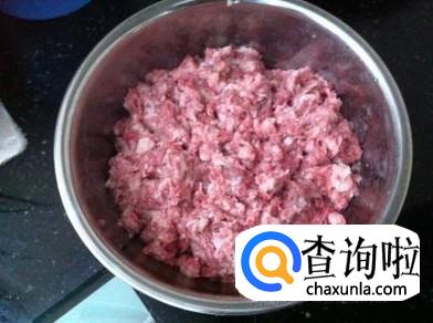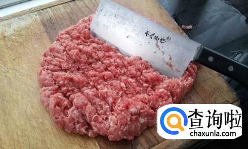 切好荠菜以后就开始剁猪肉,同样将猪肉剁碎,如果觉得麻烦可以去肉店里面用机器绞,然后将剁好的猪肉和荠菜混合。