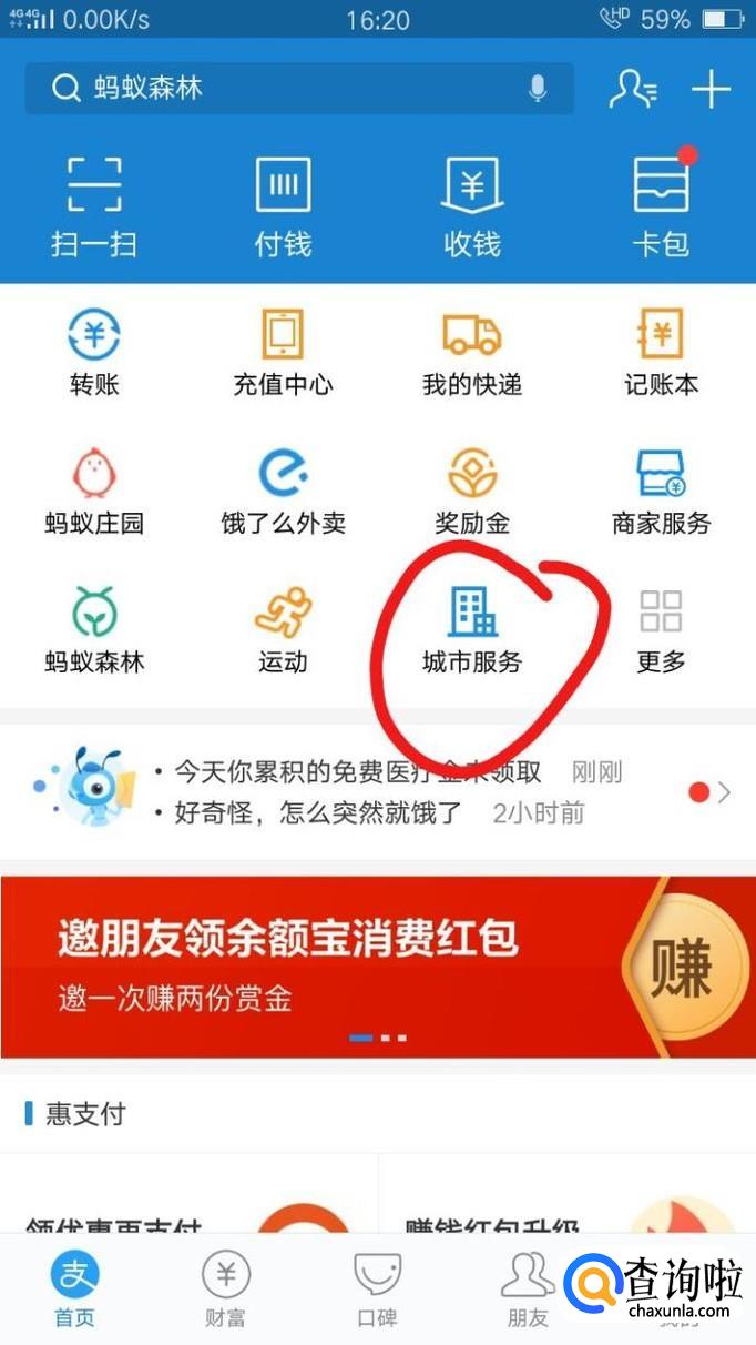 首先,打开支付宝,首页上显示城市服务,点击。