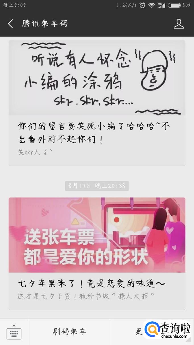 打开手机的微信,搜索公众号腾讯乘车码,没关注过的点击关注,关注后点击进入
