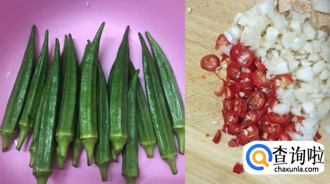 将洗干净的秋葵放在一边备用,蒜拍碎,朝天椒切碎。