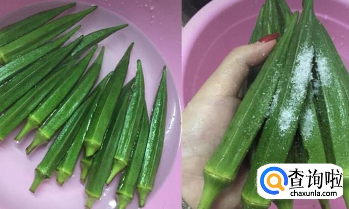 秋葵用盐水泡一泡,用盐把表面绒毛搓掉,洗净。
