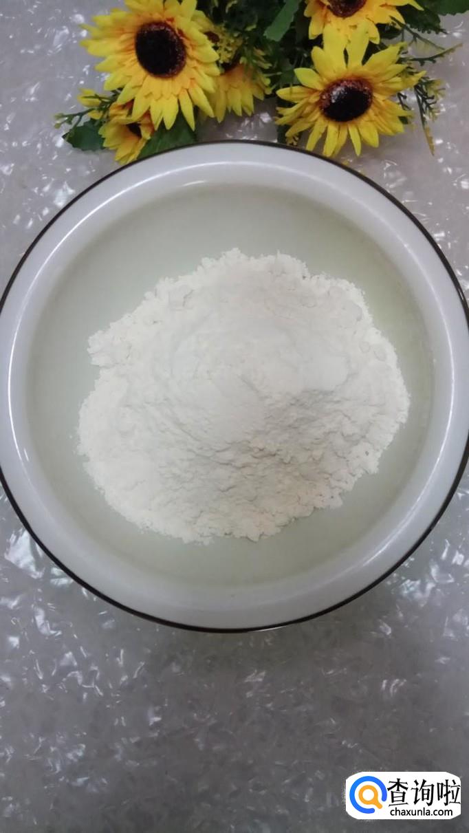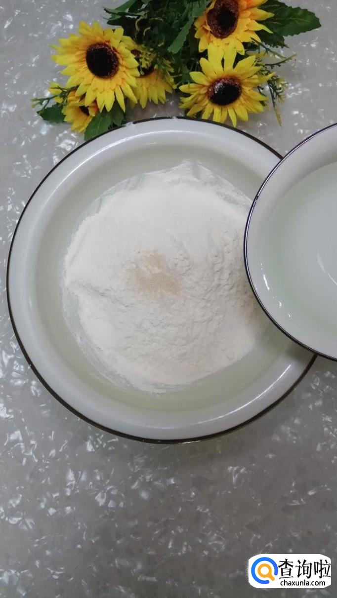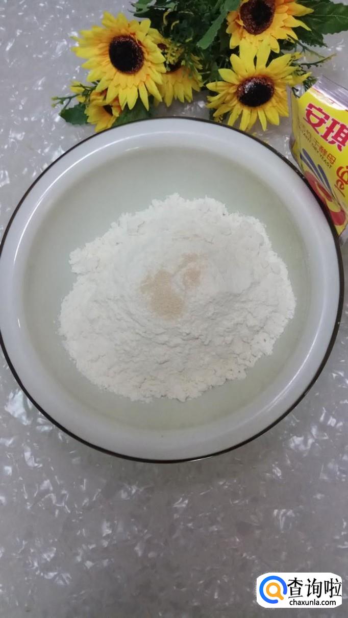准备适量面粉,加少许酵母粉,酵母粉的量可以稍微多一些,这样可以加快发酵的速度。