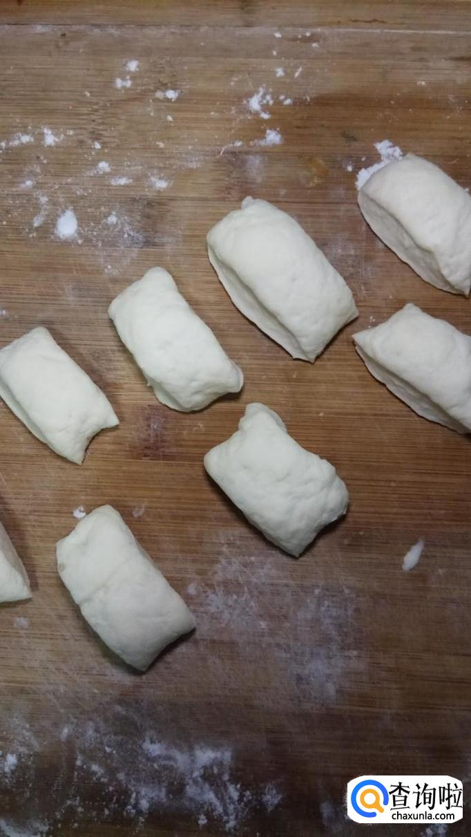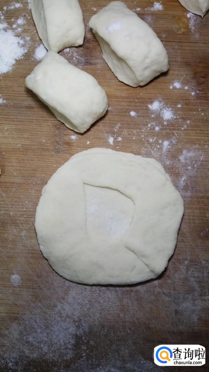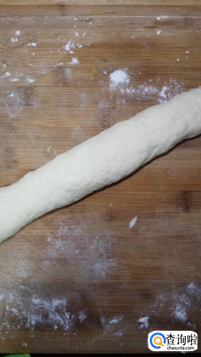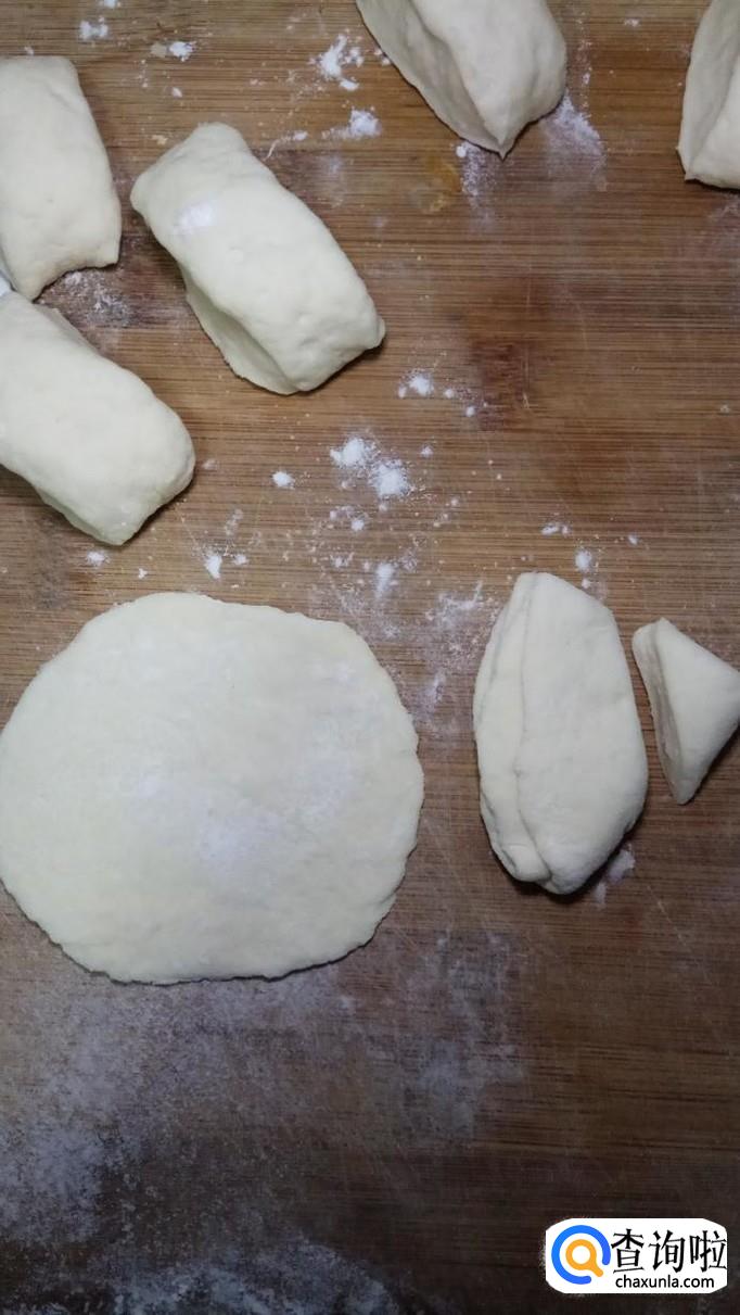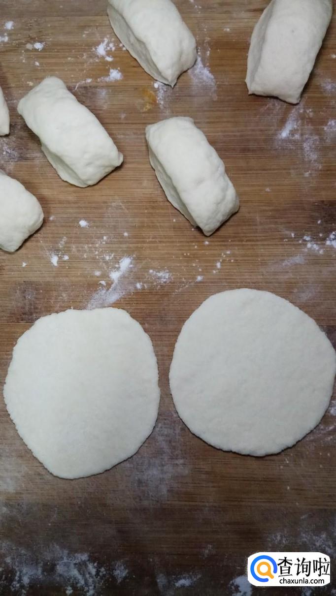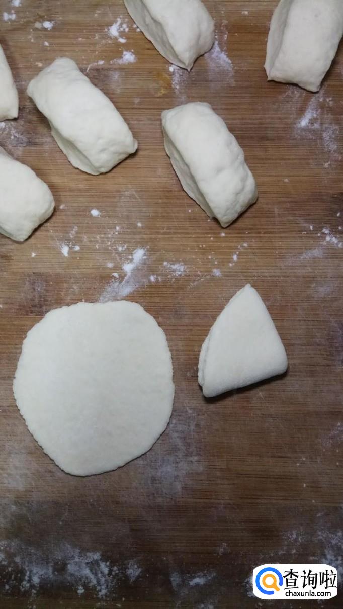 面团醒好之后,取出来,然后用手揉一下,搓成长条,分成小剂子,然后擀成大小一样的薄片。