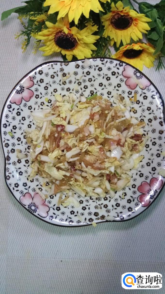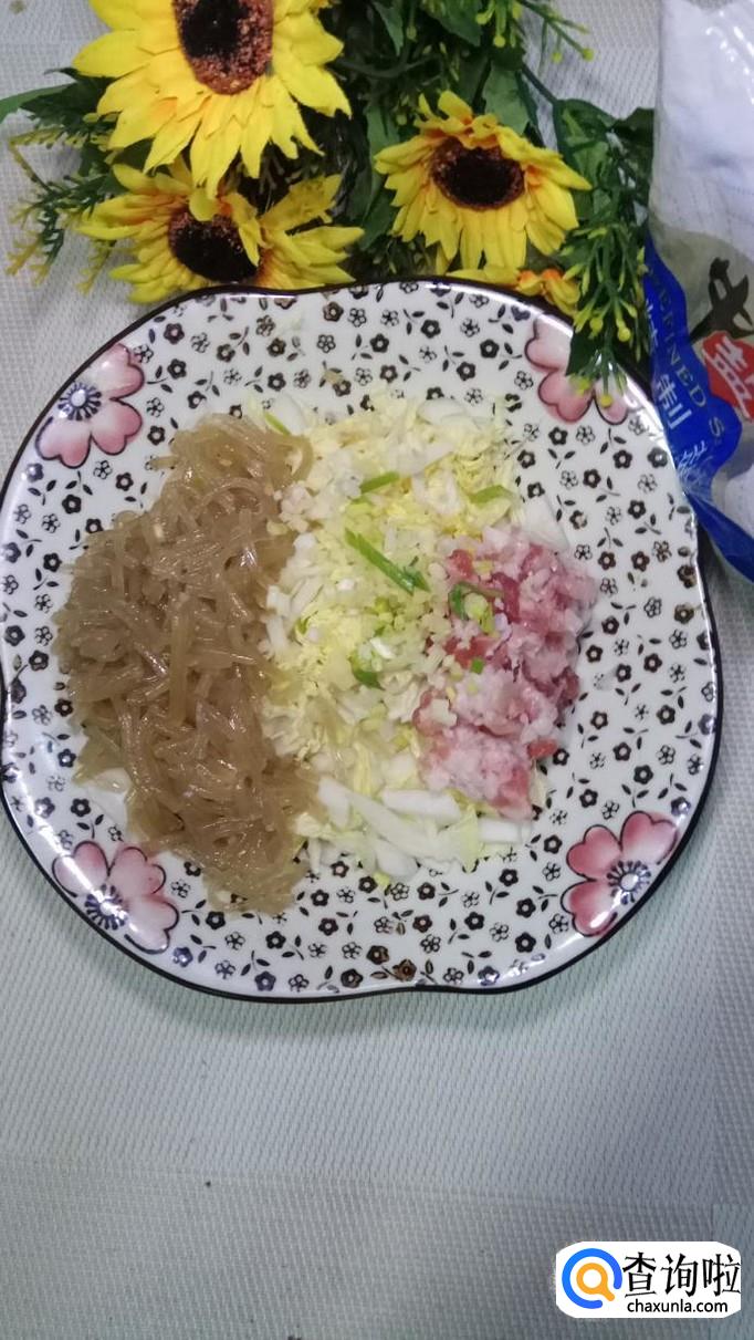 将粉丝用清水泡发切成碎末,再准备适量白菜切碎,将他们和五花肉末放在一起,放入适量盐,鸡精,五香粉,生抽,料酒,搅拌均匀,做成馅。