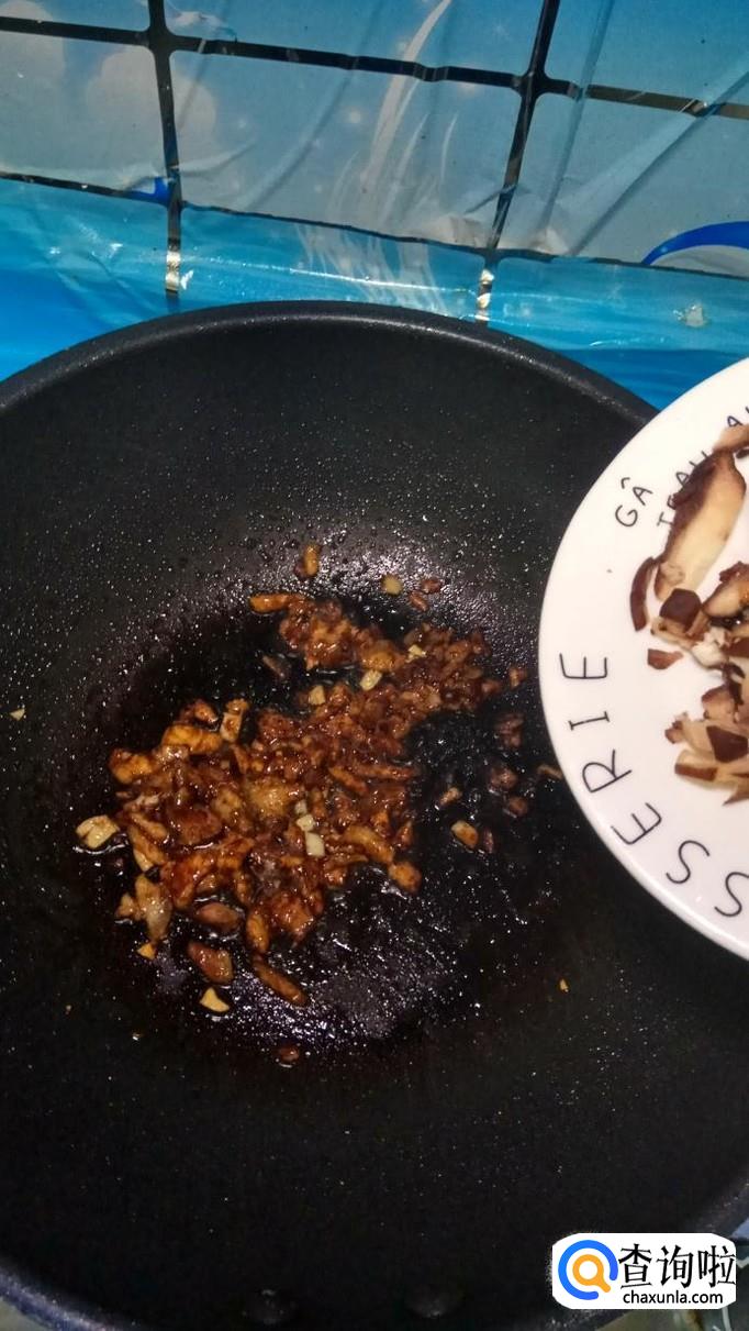 将切好的香菇块放入锅中,和五花肉一起翻炒,炒至变软就差不多了。