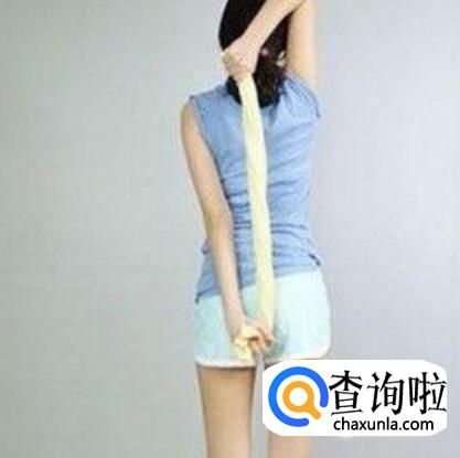 2、用另一只手在腰部或臀部等觉得舒服的位置拉住毛巾另一头,轻轻下拉完成拉伸运动。