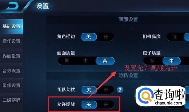 接下来在设置界面中我们将允许观战的开关打开,如下图所示