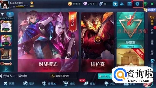 首先登录进王者荣耀,然后点击右上角的设置按钮,如下图所示