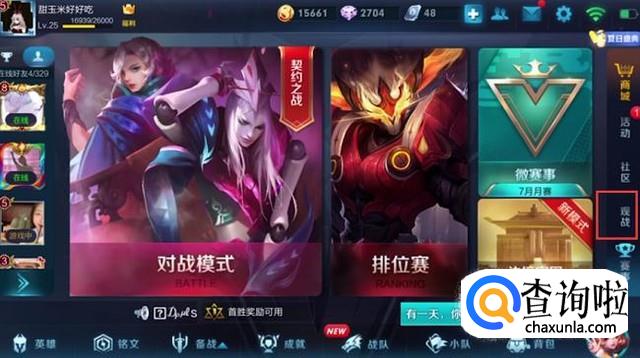 然后我们重新回到游戏的主界面,点击右侧的观战选项,如下图所示