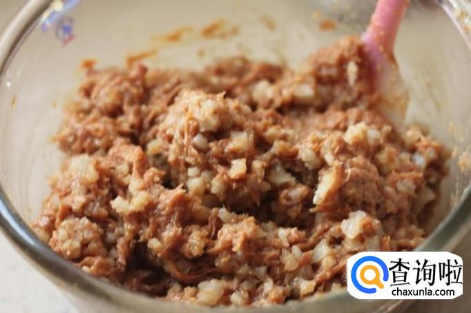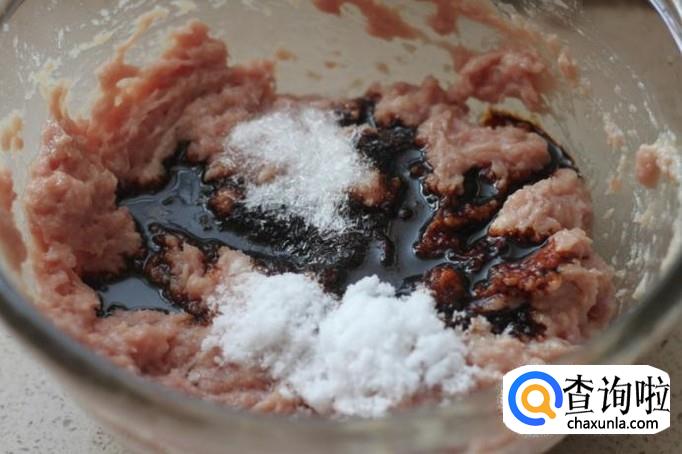 同时,将猪肉切成肉末,然后加入老抽,料酒,盐,味精,葱姜水,搅拌使混合均匀。