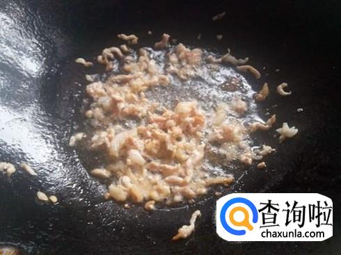 锅里加入底油烧热,放入肉丝煸至颜色变白。