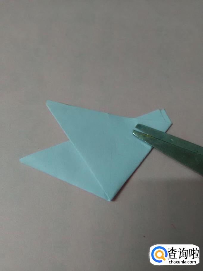 将右边的角向左折到五分之一处,左边的小角占一份,右边因为是双层的,每层占两份宽。