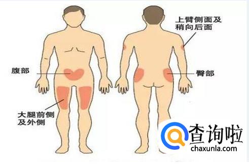 胰岛素注射部位多选脂肪层较厚的部位,易于吸收,如大腿前外侧、腹壁、手臂外上侧和臀部上侧1/4处等,注射时应注意更换注射部位,避免形成硬结。
