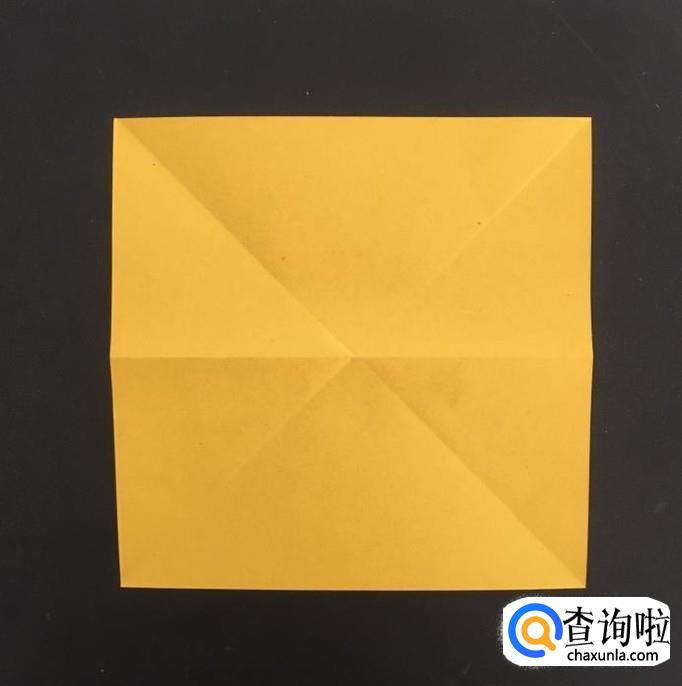 取出一张正方形卡纸,分别沿着两条对角线方向对折并展开,然后向后对折。