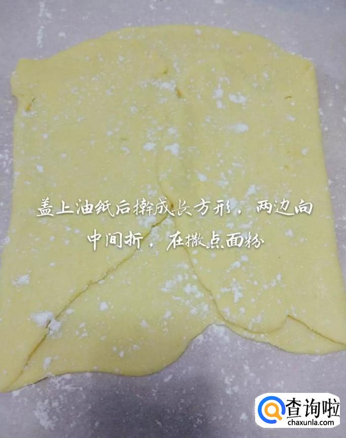 然后拿出冷藏好的面团放到油纸上,另外取一张油纸,撒上面粉盖在面团上,如下图所示。