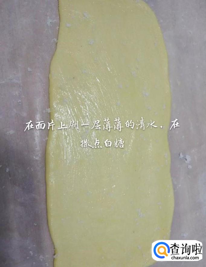 然后把面饼擀成牛舌状并涂抹上一层清水和白糖,如下图所示。
