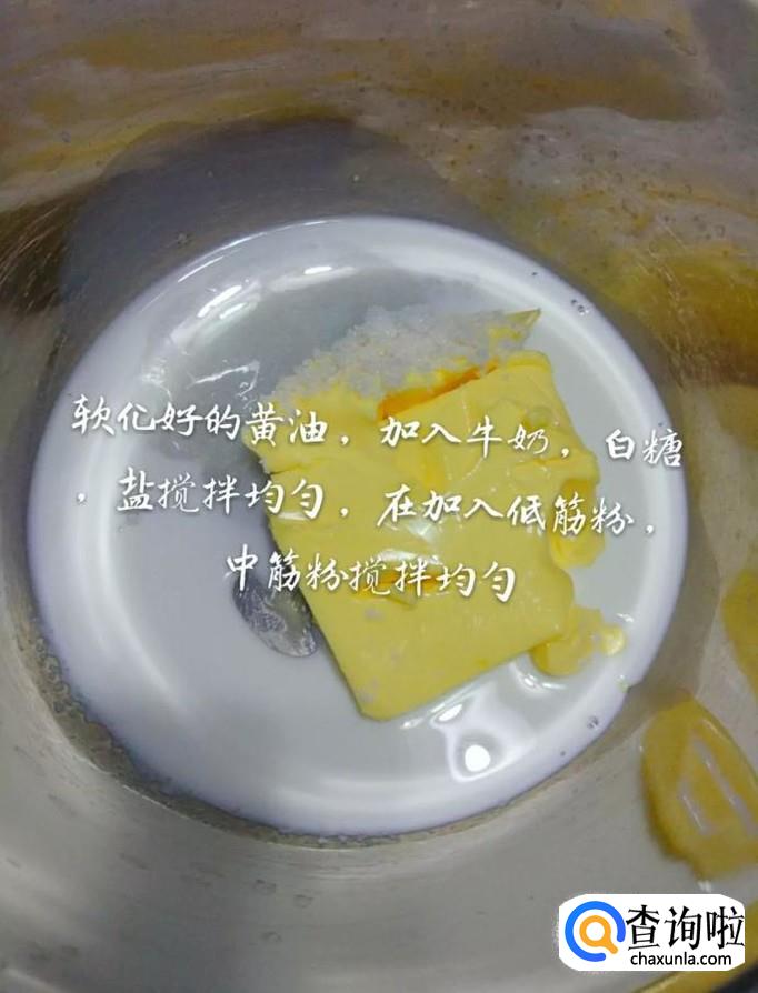 首先在软化的黄油中加入牛奶和白糖和盐,搅拌均匀;之后加入低筋面粉和中筋面粉,搅拌均匀,如下图所示。