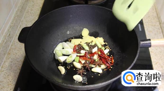 另起一锅,待油烧热后,放入切好的姜片、大蒜、大葱、青葱白、八角、干辣椒、花椒,一起爆香。