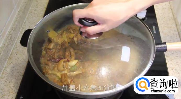 然后倒入一听啤酒,加入蚝油一起翻炒。翻炒均匀后盖上锅盖,开小火煮20分钟。