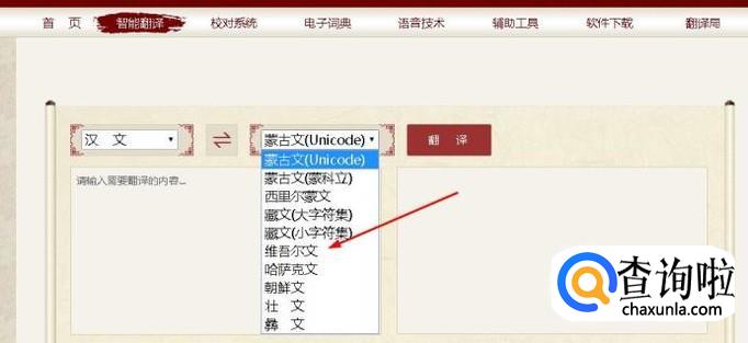 进入智能翻译后,选择需要将汉语翻译成所需的语言,如下图所示,我们选择“维吾尔文”即可。