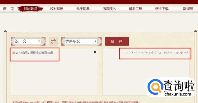在左边文本框中输入汉字后,点击“翻译”,右边文本框就会显示对应的维吾尔文。如下图: