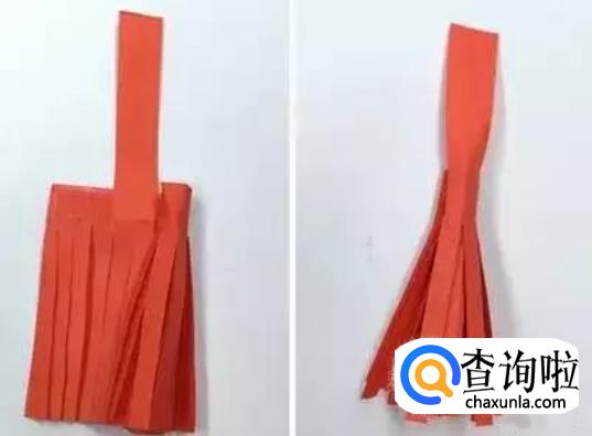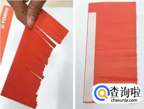 还有一个就是做流苏!我们再取一张红色彩纸对折,然后沿底部向上,剪出规则的细条(注意不要完全剪断哦);另外剪下一根约1cm的纸条备用。