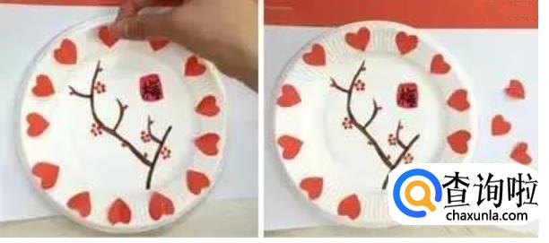 是不是觉得盘子四周看起来空空的?不如加上一点装饰吧!选一张红色彩纸对折,画出半个爱心然后剪下,围成一圈就是很好的点缀。用双面胶或固体胶把小爱心均匀地贴在盘子四周空白处。